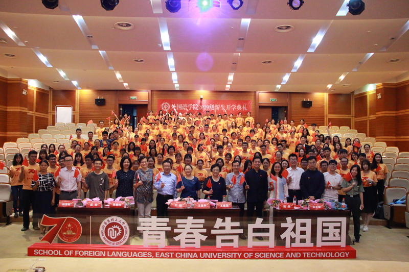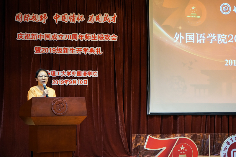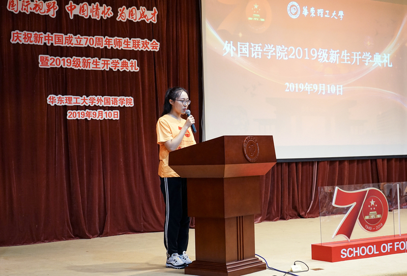9月10日晚,外国语学院在奉贤校区敬贤堂举行庆祝新中国成立70周年“青春告白祖国”师生联欢会暨2019级新生开学典礼。外国语学院首任常务副院长王亚平,学院党委书记王喆、副书记樊俊,副院长张正军(主持工作)、吴建伟、赵宏,英语系系主任杨慧敏、研究生导师组组长王建国、新生班导师代表和军训教官以及205名2019级新生参加活动。樊俊主持开学典礼。