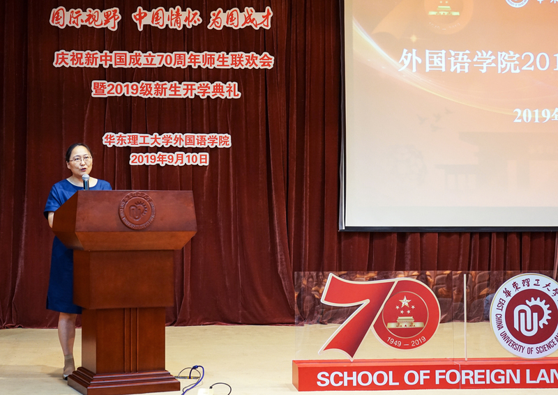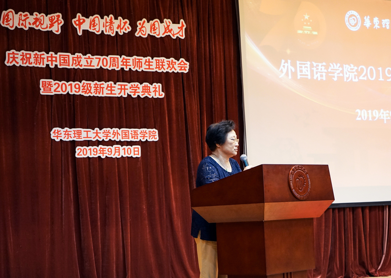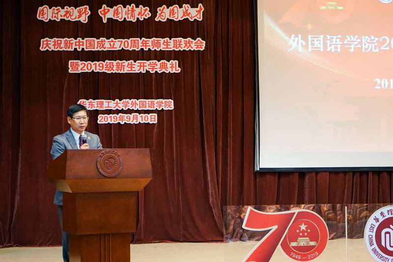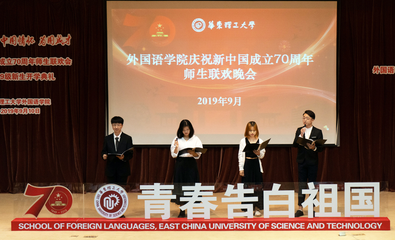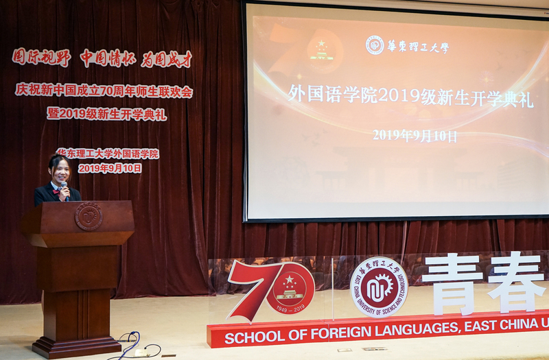9月10日晚,外国语学院在奉贤校区敬贤堂举行庆祝新中国成立70周年“青春告白祖国”师生联欢会暨2019级新生开学典礼。外国语学院首任常务副院长王亚平,学院党委书记王喆、副书记樊俊,副院长张正军(主持工作)、吴建伟、赵宏,英语系系主任杨慧敏、研究生导师组组长王建国、新生班导师代表和军训教官以及205名2019级新生参加活动。樊俊主持开学典礼。