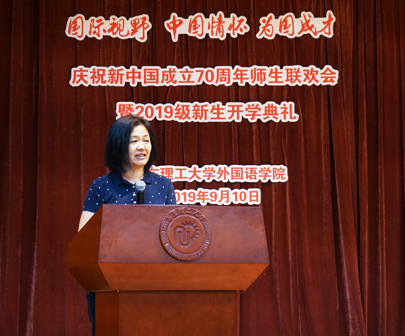 典礼上,王喆代表学院致辞,表达了对新同学们的欢迎,对老师们教师节的祝贺和对新中国成立70周年的祝福。她希望同学们通过努力学习,成为具有国际视野、拥有中国情怀、敢于创新创造、担负起强国重任的中国文化的传播者。