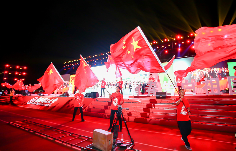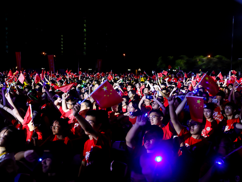 当晚,伴随着飘扬的五星红旗,近8000名新生也挥动起手中的小国旗,共唱《我和我的祖国》,用青春告白祖国,礼赞新中国成立70周年。