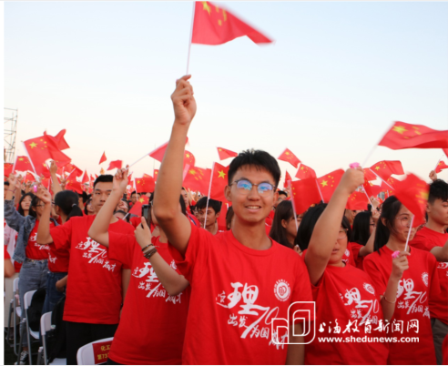 伴随着慷慨激昂的《歌唱祖国》,一面巨幅五星红旗在2019级新生们手中接力传递,传递着对祖国的深情,也传递着爱国奋斗、报效祖国的澎湃激情。