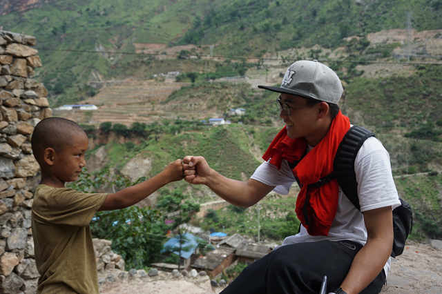 在当地爬悬崖村的时候,杨孟平还遇到了两个小孩子,一个一年级,一个还没上学。他们拿着柴火燃尽后的碳,在路边写字。哥哥边写边告诉弟弟自己写的是什么字,弟弟一边跟着念,一边学着写。杨孟平当时特别懊恼自己竟然没有带本子,他所能做的是把书包里仅剩的两支笔送给他们。