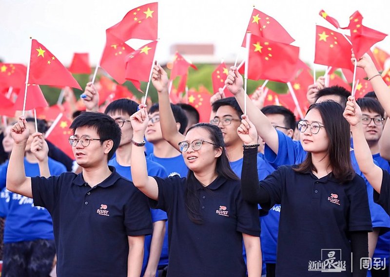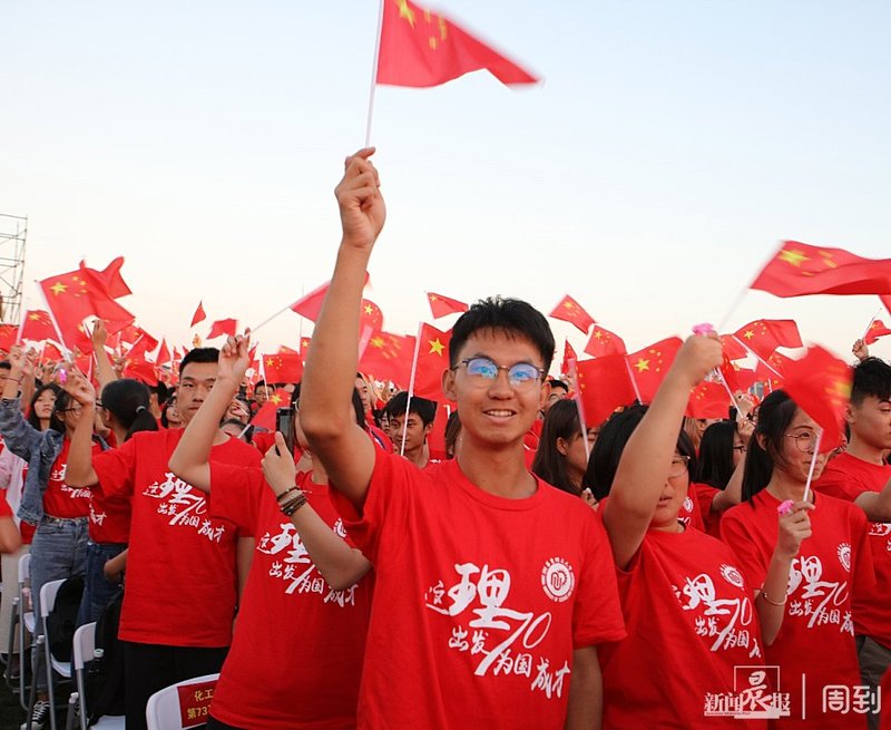 伴随着飘扬的五星红旗,近8000名新生也挥动起手中的小国旗,共唱起《我和我的祖国》,用青春告白礼赞新中国成立70周年。