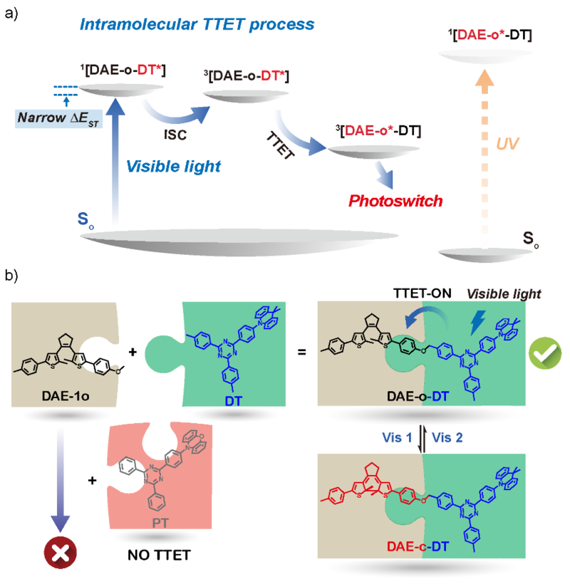 为了实现全可见光控分子开关体系的构建并平衡可见光激发与光调控性能,田禾院士团队提出三线态敏化光致变色策略:一方面,三线态敏化剂具有比二芳基乙烯开环体更低的单线态能级,具备实现长波长可见光激发光致变色的潜能;另一方面,三线态敏化可以阻止常规单线态激发过程中光副反应的通路,有效减少光副产物的产生,从而实现开关性能的提升。该工作的最大亮点则在于采用窄单-三线态带隙分子作为三线态敏化剂,同时实现了可见光调控的可行性及高效率,并进一步简化了分子设计。窄单-三线态带隙分子是一类单线态与三线态能级相近的新型功能分子(< 0.5 eV),目前已被广泛应用于热致延迟荧光(TADF)材料的应用研究领域。由于其较窄的单-三线态带隙,敏化剂在灵活匹配二芳基乙烯三线态能级的同时满足对应激发光波长移向长波长可见光区域。这一设计有效解决了传统可见光激发敏化剂的三线态与二芳基乙烯三线态能级之间能级不匹配、无法实现三线态敏化光致异构的问题。同时,分子开关体系的构建只需在三线态能级匹配的原则下按照不同激发波长要求将现有的开关母体与敏化剂进行灵活配对,进行混合/掺杂或简单的共价连接。非共轭连接使开关与敏化剂之间相互“独立”,防止两者之间电子状态的相互干扰,从而造成性能的不可预知性。更为重要的是,其规避了传统共轭增长设计中光调控性能受损的问题。此设计策略简化了开关分子的设计、提升了性能的可预估性、降低了合成与产品开发的风险。此外,窄单-三线态带隙分子(pi-pi*)具有较高的摩尔消光系数,相比常规的n-pi*类三线态敏化剂(比如2, 3-丁二酮等),其敏化效率显著提高,为高效三线态敏化提供了必要条件。