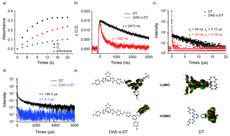基于此策略构建的光开关分子DAE-DT可在420 nm与550 nm波长的光激发下进行可逆光调控。DAE-DT的光致异构行为不仅呈现出与常规紫外光激发同样高效的闭环量子产率与光环化反应转化率,同时展现了极佳的抗疲劳性(即可逆循环性能)。相比于常规紫外光激发下的迅速光老化(5次循环损失过半),三线态敏化可见光开关可以稳定工作至少10个循环以上(损伤率< 5%),体现了三线态敏化在光致异构体系设计中的优势。通过超快光谱捕捉三线态寿命、研究瞬时/延时荧光等方法,进一步验证了可见光光致异构过程中的三线态能量转移(Triplet-triplet energy transfer)过程及机制。