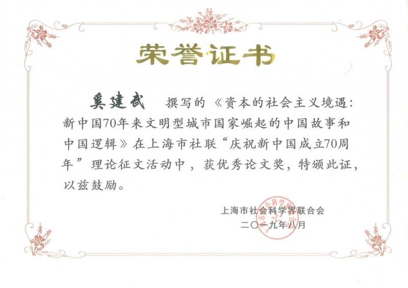 近期,我校马克思主义学院奚建武副教授撰写的《资本的社会主义境遇:新中国70年来文明型城市国家崛起的中国故事和中国逻辑》和邱卫东副教授撰写的《科学社会主义在新中国70年历程中演进逻辑探析》,荣获上海市庆祝新中国成立70周年理论征文优秀论文奖。