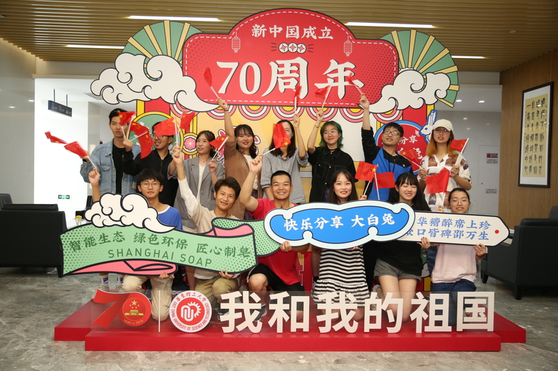 上海制皂、邵万生、大白兔、鲜得来,是什么吸引了四家鼎鼎有名的上海老字号齐聚在这里?9月27日下午,在庆祝中华人民共和国成立70周年之际,艺术学院的 “艺术党课”再次开讲。现场精心布置了老字号品牌的产品陈列展,还有“我和我的祖国”校园打卡点。在课堂上,平均历史超过90年的上海老字号代表人,共同为200余名党员和学生讲述了老字号品牌的祖国情、民族魂。