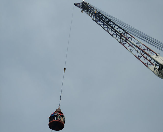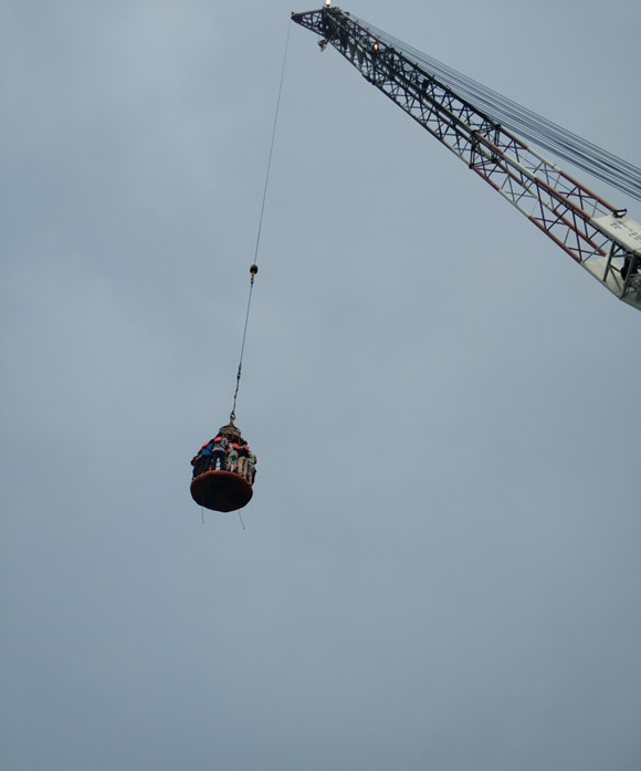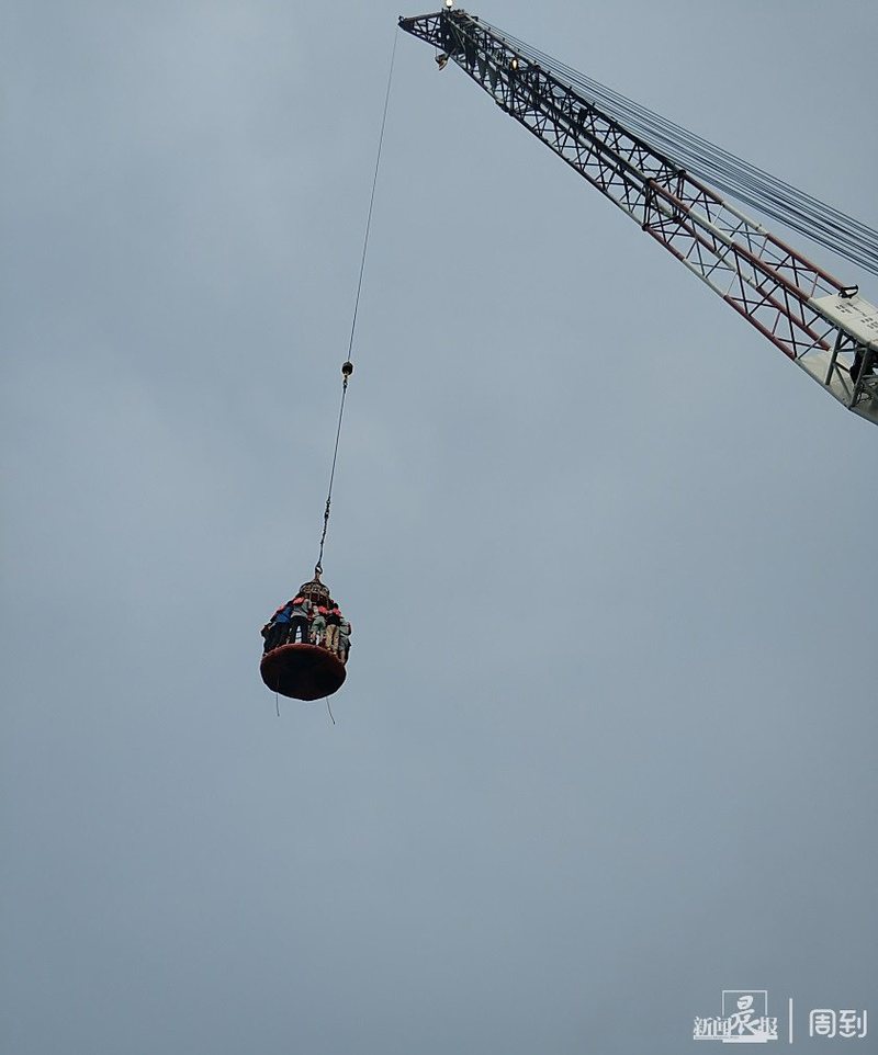 “我们跟中海油平台工作人员一样,先乘坐拖轮到达平台后,再通过吊笼实现从拖轮到各平台的登、离。我们必须穿好救生衣,站在吊笼外侧,双臂抱紧吊笼。像登上CEPI平台,吊笼自海平面起吊至顶层甲板处,吊装高度约40米。”