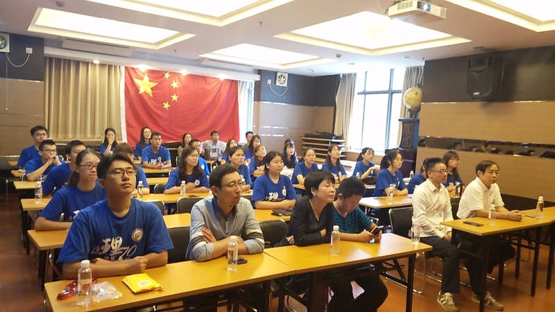 上午9:00,徐汇校区逸夫楼报告厅、奉贤校区敬贤堂座无虚席,教师、研究生和本科生等分别在此收看实况直播。除此之外,许多师生还在食堂、宿舍、实验室等多个场所观看直播,共同感受这一伟大时刻。