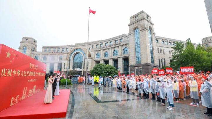 五星红旗在风雨中迎风飘扬,复旦附小学生童声齐唱《今天是你的生日,中国》,唱出“小儿女们”心中期望的歌;现场复旦人挥起小国旗,集体合唱《歌唱祖国》, 用嘹亮歌声迎接新中国成立70周年。