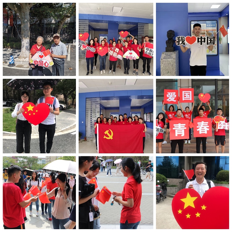 活动当日,学院师生着统一服装,走上学校街头、走进学生宿舍、走入教工实验室,向全校师生分发手摇五星红旗,邀请师生与国旗合影,录制向祖国告白的小视频。学院师生还组成70周年造型齐唱《国家》,为祖国母亲献上最诚挚的生日祝福。