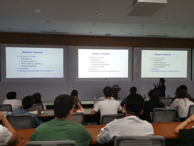 杨丹的研究涉及有机合成化学、生物有机化学、化学生物学等领域,目前的研究方向包括活性氧/氮荧光探针的开发及应用、自组装离子通道及转运蛋白的设计应用、利用天然产物及合成化合物探究炎症及癌症中的信号转导过程等。讲座中,她系统性介绍了其活性氧/氮荧光探针及光交联标记蛋白质方面的工作。杨丹将其深厚的有机合成背景与化学生物学相结合,设计开发了一系列高选择性、高灵敏性的小分子荧光探针(HKSOX, HKPerox, HKOCl, HKOH, HKGreen/HKYellow)分别对超氧阴离子、羟自由基、次氯酸、羟自由基和过氧亚硝酸跟实现特异性检测。探针被广泛应用于共聚焦荧光成像、流式细胞仪分析、组织染色和斑马鱼成像中。这些强有力的小分子荧光工具随后被用于氧化还原生物学和药学机理的探究中,能够加速新型诊断及治疗方法的发现,为小分子荧光探针的发展做出了突出贡献。结合近期取得的丰硕成果,杨丹由浅入深地阐述了新型探针检测机理的思路与应用。她对化学及生物应用的深入思考让在场师生深受启发。