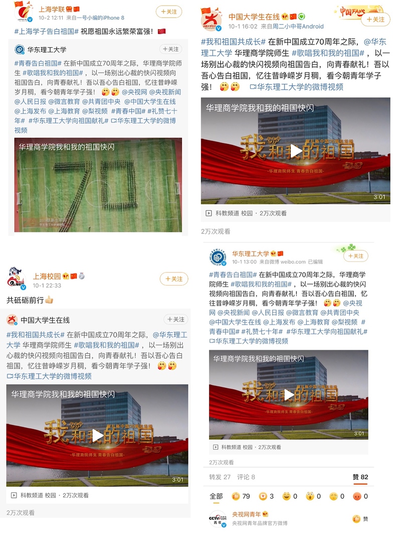 “我和我的祖国,一刻也不能分割……”在新中国成立七十周年前夕,商学院师生把拳拳爱国情、声声报国志“唱出来”“拍出来”,用一场别出心裁的快闪视频向祖国告白,向青春献礼。活动发布后更是受到社会各界的广泛关注与点赞,发布视频累计浏览量两万有余,央视网青年、教育部中国大学生在线、上海学联、青春上海、上海校园等多家官方微博发布点赞。