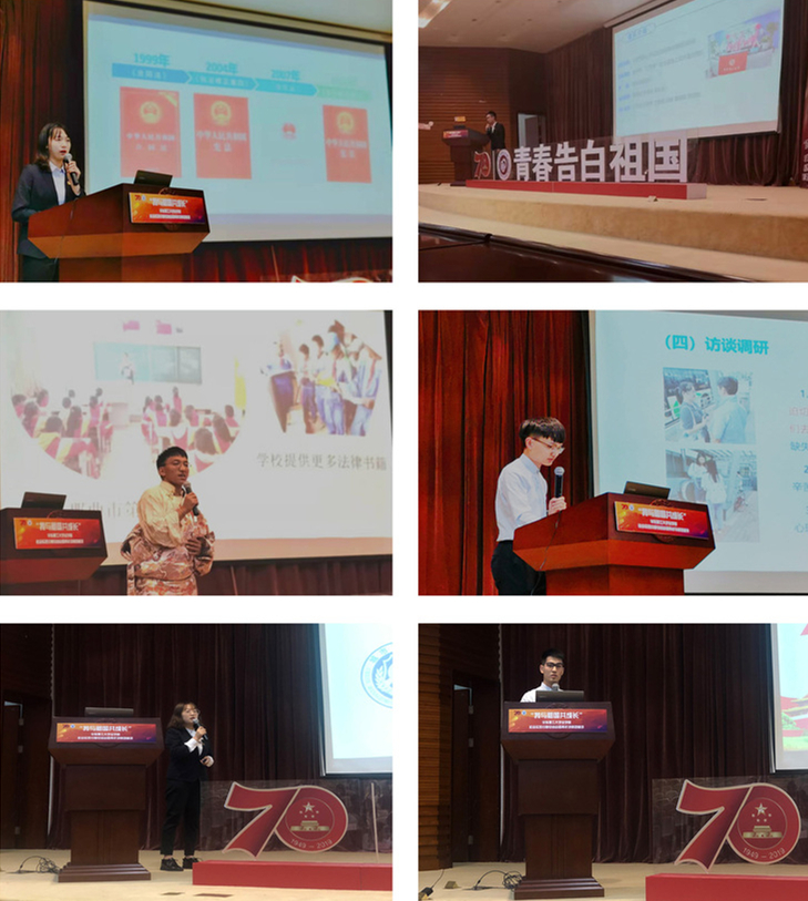 随后,来自优秀项目团队的青年讲师代表依次分享了实践中的成长与收获。“法行汝阴,土生春华”团队通过精准型定位,互动式普法,培养法治新生力量,维护外出务工人员权利;“唱响法治,普法边疆”调研活动由我院藏族学生返乡开展实地考察,进村入户帮助当地政府了解民众法律需求,提出普法建议;“法律服务的社会矛盾解决项目”致力于自助式法律服务模式,推出并上线了互联网“律程”办公服务平台,取得丰硕成果;青年红色筑梦之旅重温习近平知青岁月,在延安乡村接受红色革命教育,传承革命精神,探寻红色老区新貌发展;天然气“照付不议”合同法律宣讲组着眼特定领域法律热点问题,结合长三角发展,深入企业一线实地调研,为法律建设出力;“探索城管执法艺术,助力美国中国建设”实践团队聚焦上海垃圾分类,通过体系化的城管执法舆情引导模式找出垃圾分类新思路。
