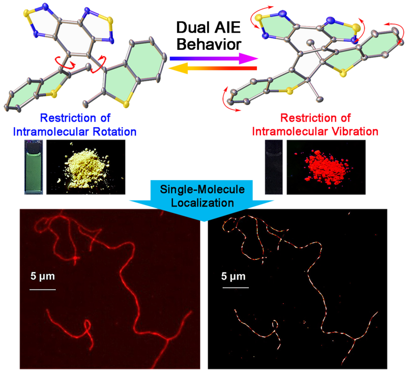 光致变色染料二芳基乙烯体系具有独特的热双稳定性、可逆性且高效的光响应性和优异的抗疲劳性能。基于朱为宏课题组独特的苯并二噻二唑位阻型烯桥染料体系,研究人员发展了系列不同空间位阻的光致变色染料,首次揭示了该系列光响应分子开环体和闭环体两种光可逆异构体不同模式的聚集诱导发光机制,完美实现了分子内旋转受限(RIR)和分子内振动受限(RIV)两种机制调控,并探讨了空间位阻对光响应性能和AIE性能的影响,为发展新型光响应AIE单元提供了全新的研究思路和设计准则。同时,该光响应AIE单元成功实现了在超分辨荧光成像领域的应用,拓宽了AIE材料的应用前景。