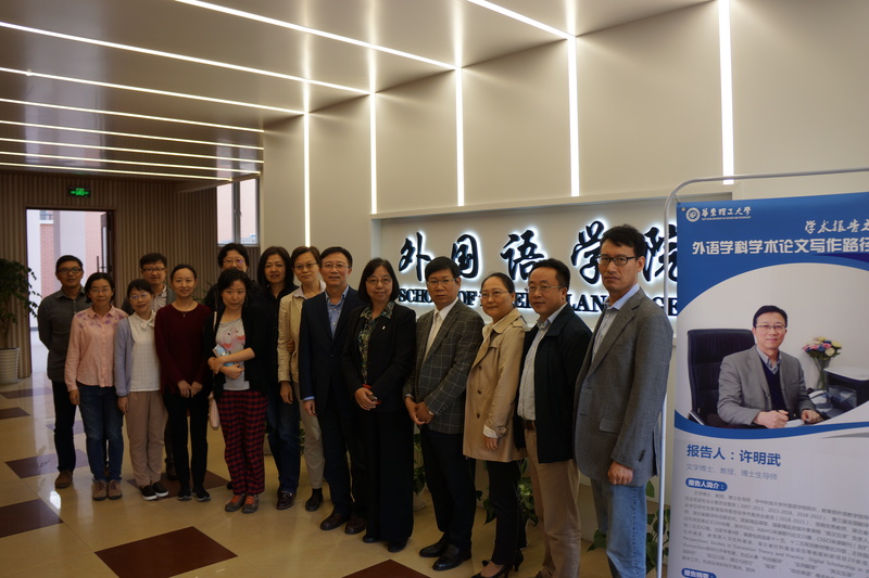 当天上午,许明武为外国语学院师生作了题为“外语学科学术论文写作路径”的讲座。他分享了在专门用途英语教学和口笔译领域丰富的实践经验和研究成果,并就学术论文的选题和论证,用幽默睿智的语言与学院师生进行了交流。