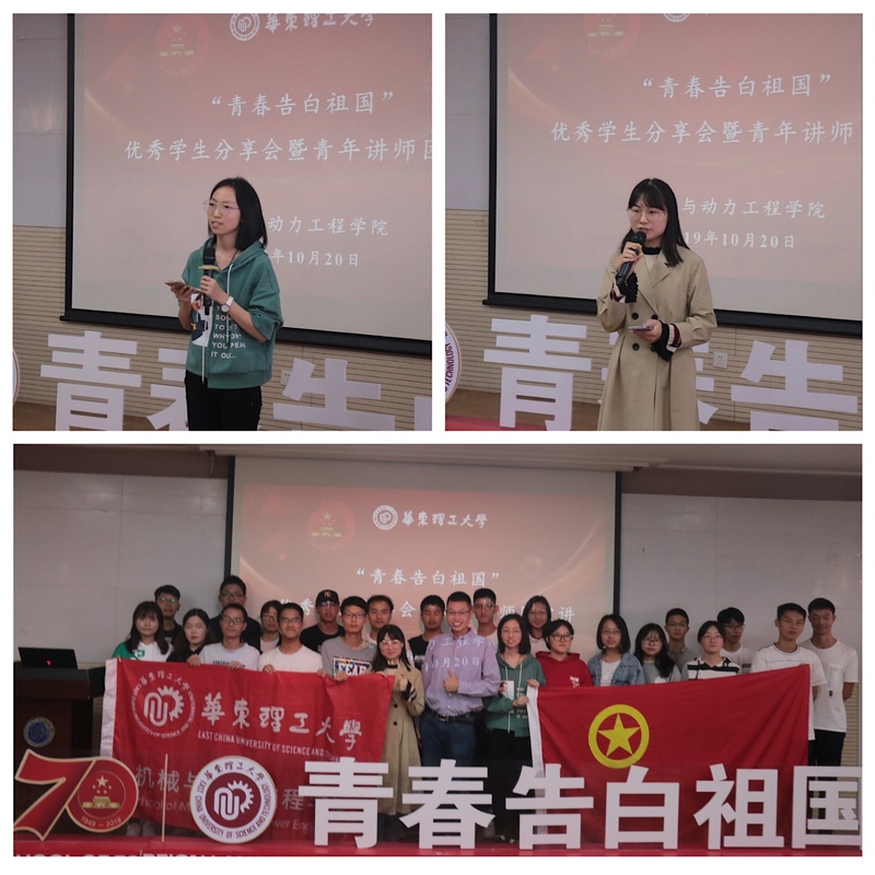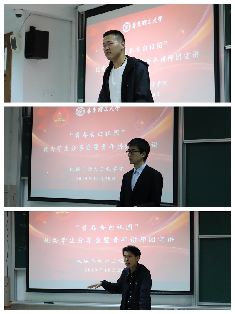 为庆祝新中国成立70周年,激励广大青年树立“爱国荣校”之情,唱响新时代青春奋进主旋律,10月20日下午,机动学院以“青春告白祖国”为主题,开展了优秀学生分享会暨青年讲师团宣讲活动。活动邀请了学院青年讲师团代表,从“小我融入大我,青春献给祖国”的角度,分享了他们学习生活中的成长与收获。活动在奉贤、徐汇两校区共同开展。活动由学院团委书记黄泽炀主持。