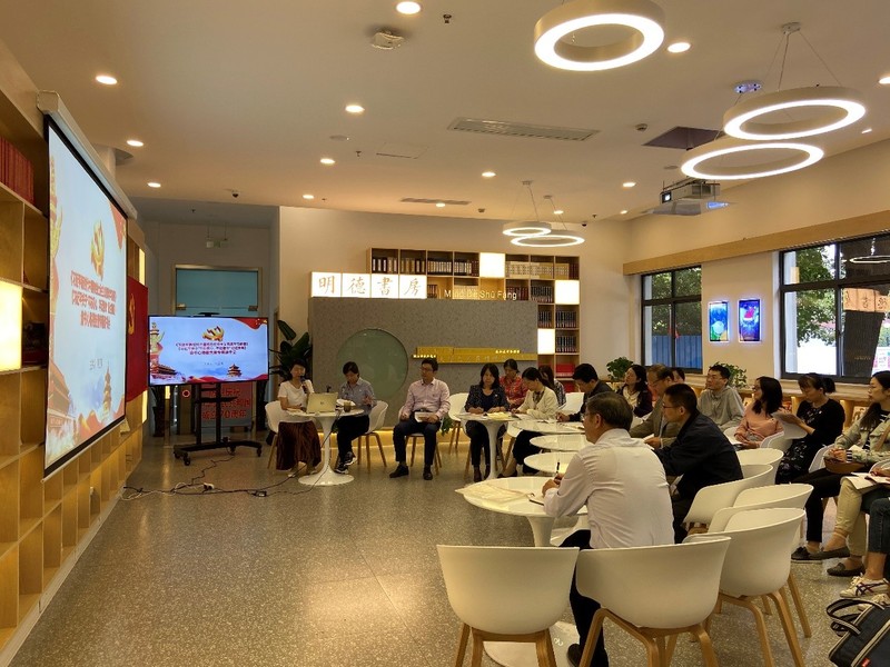为深入推进“不忘初心、牢记使命”主题教育,10月23日上午,在图书馆明德书房,图书馆第二支部书记常亚青老师就《习近平新时代中国特色社会主义思想学习纲要》(以下简称《纲要》)《习近平关于“不忘初心、牢记使命”论述摘编》(以下简称《摘编》)做读书心得报告并举办专题读书会。图书馆第二支部全体党员、图书馆其他支部部分党员群众,来自信息学院、材料学院、商学院、机关等单位支部的支部书记参加了活动。