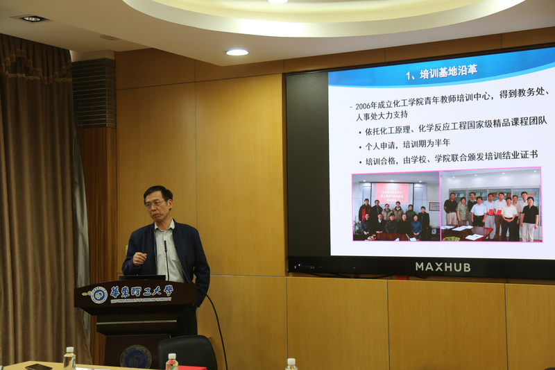 许志美首先介绍了化工类青年教师教学能力培训基地的历史沿革。该基地于2012年成立以来,以化工学院、资环学院的主要课程团队、实验中心及实习基地为依托,面向两个学院已培养了近60名青年教师。此外,许志美还着重介绍了基地培训机制。每位青年教师在带教导师的指导下,逐一完成课程教学、实验教学、实习教学、教学论文以及工程设计能力的培训,提升教学素养和教学基本功。