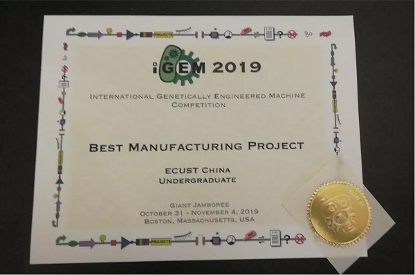 今年,华东理工大学代表队(ECUST_China)延续往年的荣耀,顺利将iGEM金奖揽入怀中!在此基础上,还从生物制造赛道(Manufacturing Track)的27支队伍中脱颖而出,获得了本赛道唯一的最佳制造类项目(Best Manufacturing Project)单项奖!据悉,中国地区今年共有128支队伍参赛,仅有7支队伍(包括华东理工大学在内的4支大学生队伍和3支高中生队伍)获得单项最佳奖。