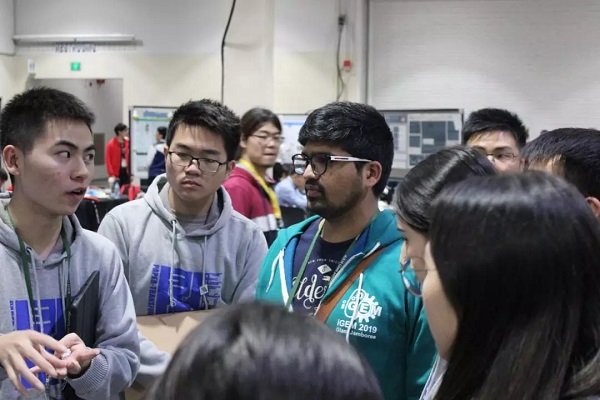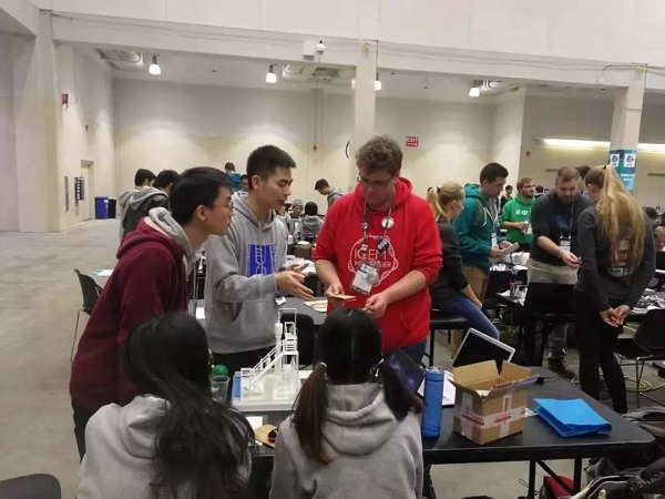 “一位来自德国团队的小哥哥来到我们的硬件展区前,被我们硬件模型的设计,尤其是那个细长的气升式发酵罐给吸引,并表达了他的疑惑。