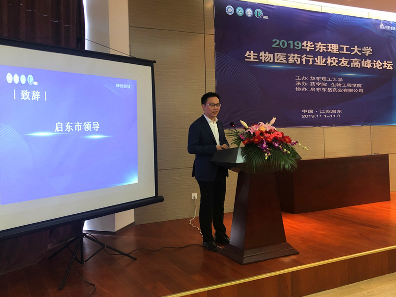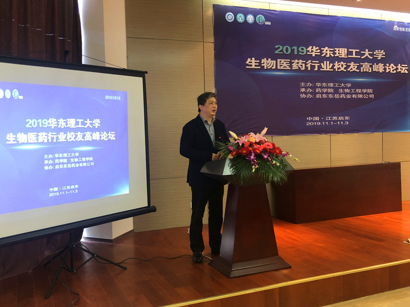 为搭建我校生物医药行业校友沟通交流协作创新平台,共同促进我国生物医药行业更好发展,2019华东理工大学生物医药行业校友高峰论坛于11月2日在江苏启东东岳药业有限公司举行。本次论坛由华东理工大学主办,药学院和生物工程学院联合承办,江苏启东东岳药业有限公司协办。我校副校长李涛,启东市人民政府副市长方波,启东市商务局局长宋海华,我校南通校友会秘书长郭光宜、校友与发展联络处处长兼校友会秘书长李建伟、资产经营有限公司董事长付尧、药学院和生物工程学院党政领导等出席。近40位生物医药行业的杰出校友和部分我校教师参加了论坛。会议由我校药学院院长宋恭华主持。