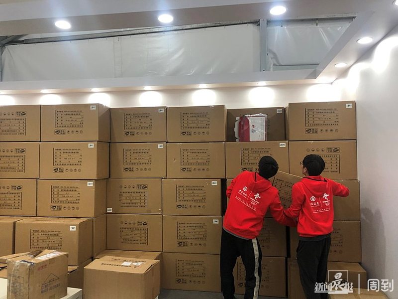 前期准备过程中,为了在短期内给嘉宾营造良好的体验环境和休息空间,装备冰雪室外展区的志愿者们秒变“大力士”“女汉子”。在半天时间里将杂乱的展区空间收拾整齐,整理搬运300余箱近4吨的物资物料。厚重的杂志,丰富的道具,志愿者们一人一箱,传递接力。