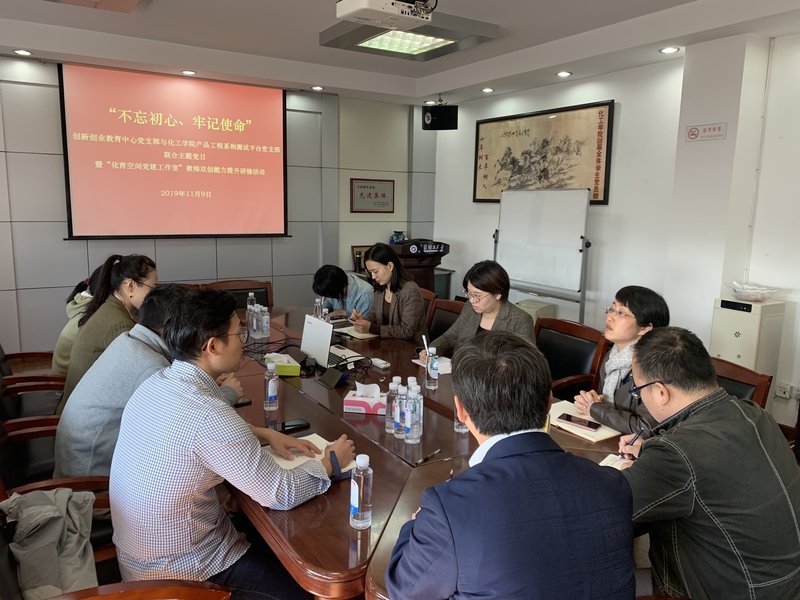 为扎实开展“不忘初心、牢记使命”主题教育,深入学习贯彻习近平新时代中国特色社会主义思想,加强教师队伍建设,全面提高人才培养质量,11月9日,化工学院产品工程测试平台党支部与创新创业教育中心党支部联合开展主题党日活动,化工学院“化育空间党建工作室”教师“双创”能力提升研修活动同日举行。创新创业教育中心副主任、党支部书记司忠业,化工学院党委副书记高艺霞,化工学院“化育空间党建工作室”负责人、产品工程测试平台党支部书记赵世成以及两个支部的全体党员教师参加了本次活动。
