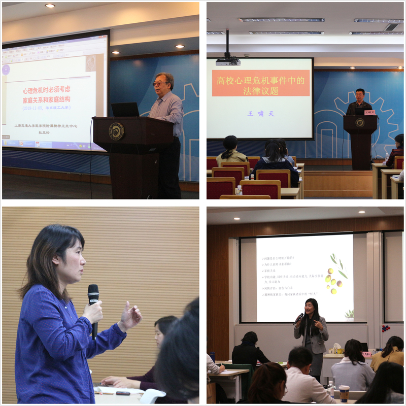 本次培训为期4天,共分为7个单元,集合了本领域的资深专家就“大学生心理危机干预工作实务”这一主题进行了多层次的讲解。上海交通大学医学院附属精神卫生中心杜亚松教授就心理危机干预的家庭视角及资源运用进行了细致讲解;华东政法大学心理咨询中心主任王啸天博士从法律角度解析心理危机干预问题;上海交通大学医学院附属精神卫生中心刘乐医师、刘漪医师、钱昀医师、江文庆医师、赵志民医师等就心理危机的评估、心理危机的诊断、心理危机的药物治疗及心理辅导、突发事件后大学生的心理救援、自杀的识别与预防等议题分别从各自的专业视角,并结合多年工作实践中的案例、经验以及研究成果进行生动、详细的讲解。