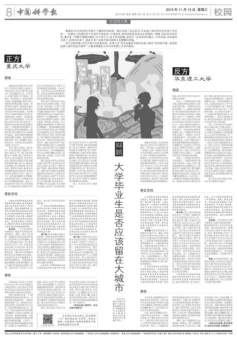 11月13日,《中国科学报》在第八版以整版篇幅刊发了我校学生和重庆大学学生围绕“大学毕业生是否应该留在大城市”辩题展开的辩论。全文刊登如下。