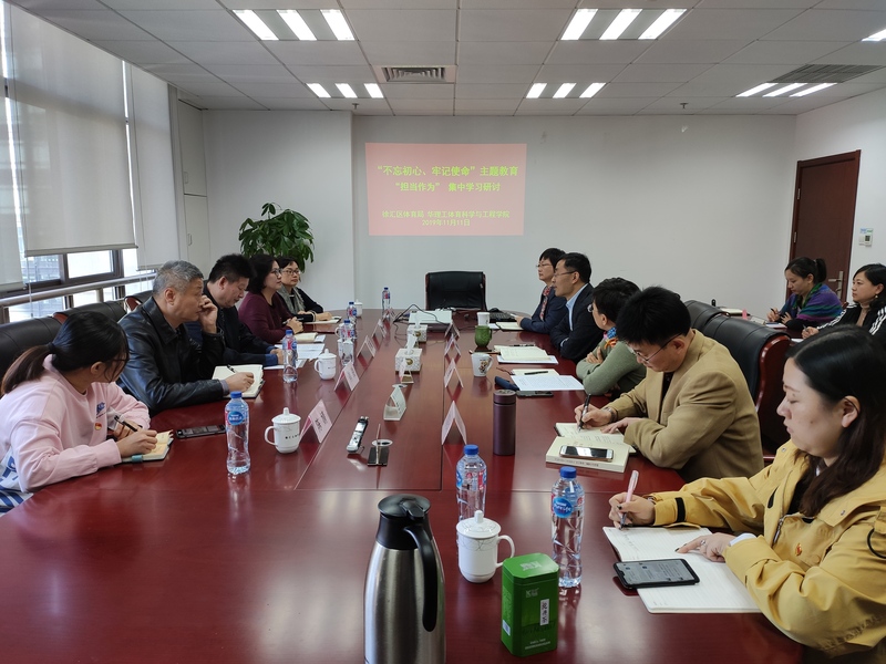 11月11日上午,体育科学与工程学院党委与徐汇区体育局党组联合开展了以“担当作为”为主题的“不忘初心、牢记使命”主题教育联组学习,体育局党组书记安玉海,徐汇区民革副主委、局长张缨,我校体育学院党委书记姚文、院长王跃等中心组成员参加了此次学习。联组学习由安玉海主持。