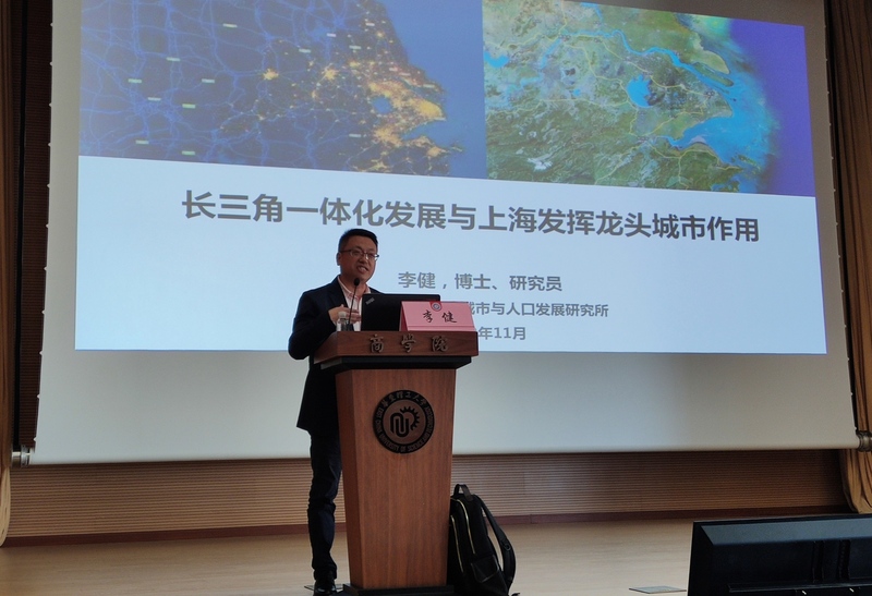 李健作了题为“长三角一体化发展与上海发挥龙头城市作用”的主题报告。李健介绍了长三角区域一体化发展逐步上升为国家战略的经过,并通过地理学方法演绎了长江三角洲地区的时空演化过程,分析了长三角一体化发展战略的背景和动力,并为师生解读了2019年5月中共中央政治局会议审议通过的《长江三角洲区域一体化发展规划纲要》的主要内容。他指出,从全球范围看,基于城市的竞争将逐渐演变成为更大范围的城市与区域竞争。上海作为长三角地区的龙头城市,必须在空间布局、功能体系、规划对接、区域合作等方面发挥引领作用。报告内容丰富,紧跟形势,让与会师生对长三角一体化发展国家战略有了更全面的认识。