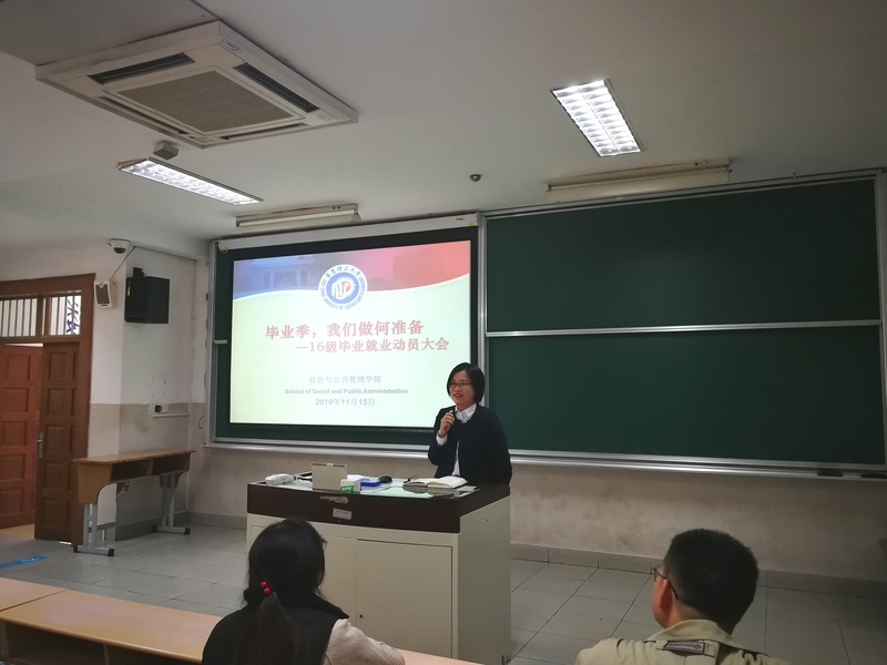 为进一步引导2020届本科毕业生认清当前严峻的就业形势、准确把握就业政策,11月15日上午,社会与公共管理学院在四教102召开本科毕业班毕业就业动员会,对2020届毕业生毕业就业工作进行广泛动员。会议邀请了校就业指导中心潘聪聪老师为同学们答疑解惑,分享毕业季的各项流程与时间节点。社会学院党委副书记万胤婕、2019级辅导员吴维祺出席会议。会议由毕业班辅导员严任舟主持。