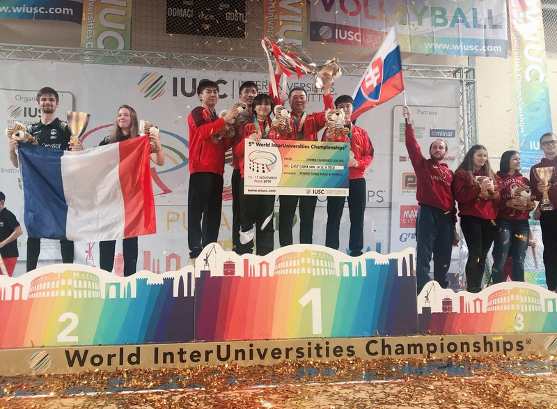 图片说明:我校学子代表中国大学生乒乓球队荣获第五届世界大学生校际运动会乒乓球项目团体第一名