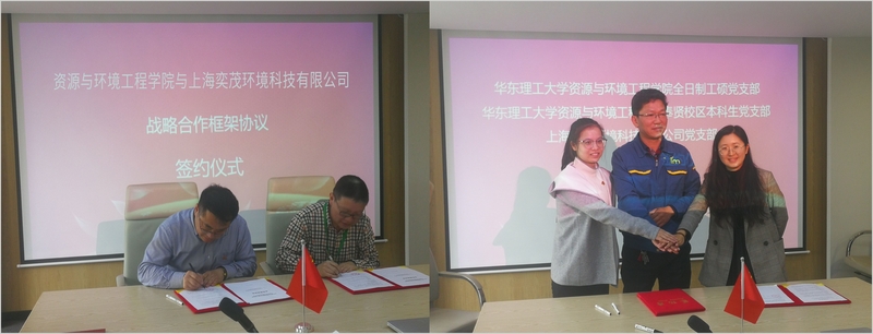 11月21日上午,我校资源与环境工程学院与上海奕茂环境科技有限公司共建签约仪式举行。奕茂环境总经理沈建中,副总经理孙超,运营中心常务副总监、党支部书记华晓,运营中心副总监张永余,技术部部长向希蜀,工会主席华晶晶,以及资环学院党委书记修光利、党委副书记饶志雄、工会主席吴诗勇、环境工程系主任张乐华及相关教师、华理校友、研究生、本科生党员参加了此次活动。
