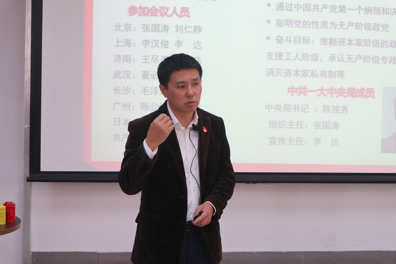 本次党课由中共一大的会议内容、与会人员、召开过程等展开,延伸到中共一大至七大会议、中共六届四中全会、五中全会等重大会议,以陈独秀、向忠发、王明和毛泽东的生平经历为依托,讲述中国共产党与茶以及茶文化的渊源。由陈独秀的家乡——安徽,说到安徽所产的茶,讲述茶的六大类——绿、红、黄、青、黑、白,并重点介绍了以“正山小种”为典型的红茶文化。随后,他进一步讲述了国共合作期间以及中国早期共产党领导人与茶的故事以及对茶的喜爱。