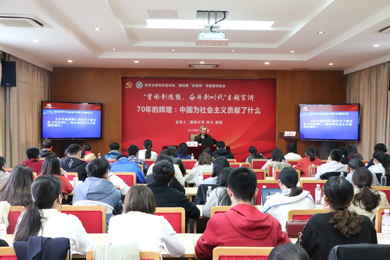 为进一步推进习近平新时代中国特色社会主义思想“三进”工作,扎实推进我校“不忘初心、牢记使命”主题教育,按照上海市教卫工作党委关于组织开展“学用新思想,奋进新时代”主题宣讲活动的具体要求,11月22日下午,我校2019年研究生辅导员培训班、第四期“研思班”邀请了国防大学政治学院教授、上海市委宣讲团成员孙力教授作了题为“70年的辉煌:中国为社会主义贡献了什么”的专题辅导报告。