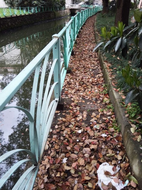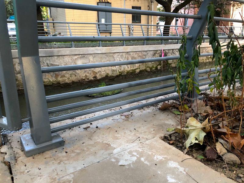 更新前的沿岸护栏,落叶容易被吹进河道,造成淤堵。