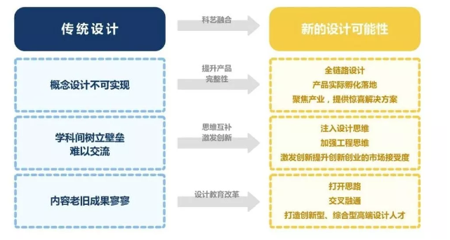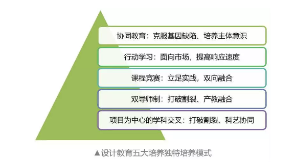 从人才培养的现实举措来看,如下五个维度的思考和行动是非常重要的:通过“产教融合”新实践,拉近大学和社会需求之间的距离,建立真实的问题背景,让教育和产业站在一起仰望星空;通过“科艺融合”新协同,将从0-1的科技创新,从1-100的设计创新,从100-1000的商业创新按照价值规律有效链接,跨界整合打通价值链;通过“创新创业”新探索,聚焦学生整体思考和系统把握能力的培养,完成从知识到能力的跨越,在创新创业的过程中完成学习过程;通过“知识体系”新定义,建立学生从洞察力、领导力、技术能力、思维方法等多维度的能力体系,以满足新时代对创意设计人才的新要求;通过“学科发展”新延伸,把握时代脉搏,形成新的高峰学科体系。这五个维度的创新体系的构建,有利于解决社会需求和人才供给不匹配的基本矛盾,为创意艺术设计行业的发展提供新思考和新动能。