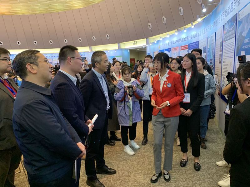 会前,2019年上海市大中学生暑期社会实践优秀项目成果展,与会领导嘉宾与师生共同观展,大家就各个项目进行了热烈讨论和交流,气氛十分热烈。