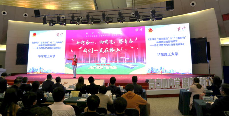 在活动现场,“知行杯”特等奖项目——“进博会‘溢出效应’对‘上海购物’品牌感知度影响研究”负责人、连续两届进博会志愿者、我校商学院学生徐思博进行了交流分享。她围绕上海打响“四大品牌”,从项目缘起、实践成果、对策建议等方面进行了介绍,鼓励上海大学生充分利用社会实践平台,服务上海城市发展建设,“不仅要做6天小叶子,365天,天天都是叶子”,充分展现了华理学子与城市发展同心同向的青春风采。