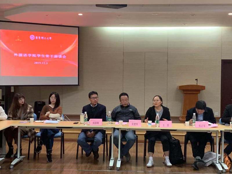 12月3日晚,外国语学院在奉贤校区E教231室召开2019年度学生骨干座谈会,学院党委书记王喆,副院长张正军(主持工作)、吴建伟、赵宏,院长助理郑国锋、辅导员以及2017-2019级本科生各班学生骨干出席会议。