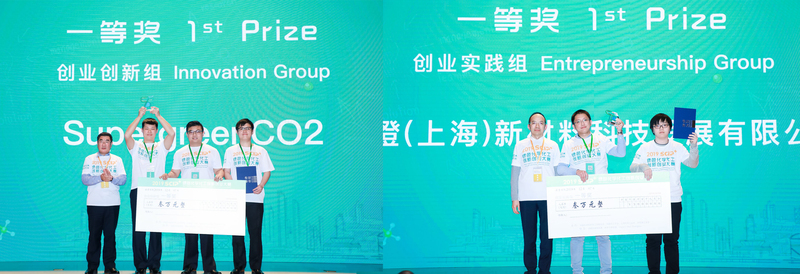 图片说明:SupergreenCO2团队、焕澄(上海)新材料科技发展有限公司分获创业创新组和创业实践组一等奖