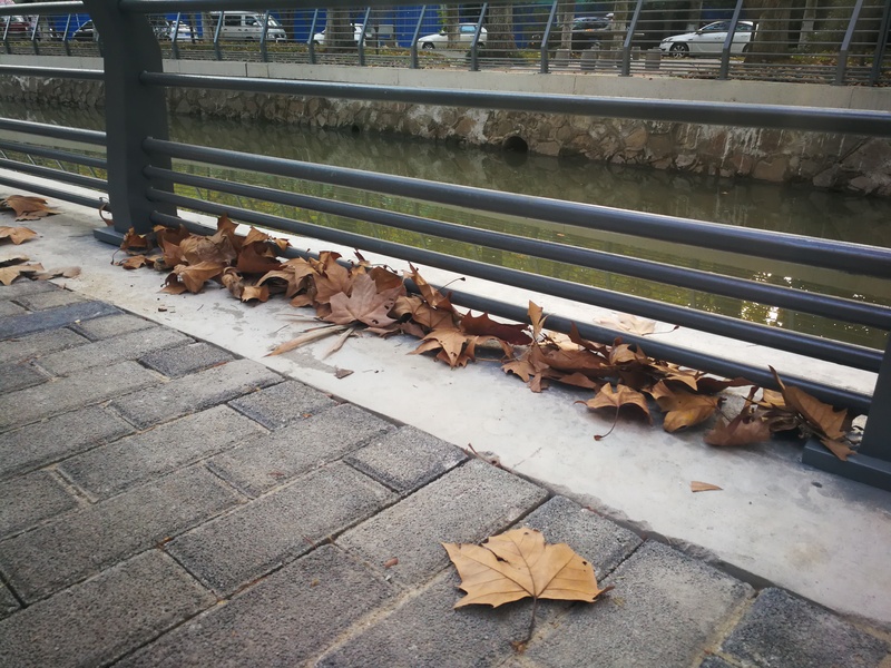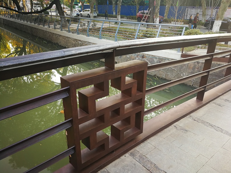 青春河的每段护栏下端都会有3根横向的更为细密的栏杆,这个设计就是基建处通过开会反复推敲议定的,可以防止大批量甚至细小落叶吹入水中,最终腐烂并淤堵河道。造型美观、牢固安全、便于后期维保则是栏杆选型的三大原则。