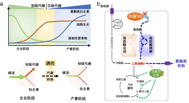 图片说明:链霉菌内源三酰甘油(TAG)在衔接初级代谢和次级代谢、调节代谢转换中的关键作用(a);基于调控TAG建立的次级代谢产物高产策略(b)。