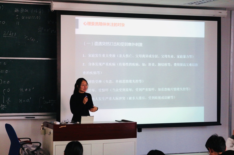 此次心理委员上岗培训由心理咨询中心副主任李永慧、生工学院兼职心理辅导教师邓亚珊主讲。培训内容涉及心理委员的角色定位与职责、大学生常见心理问题及危机识别、心理委员工作的要点等。在培训中两位老师着重强调成为一名合格心理委员的必备素质。作为一名心理委员,不仅自身应具有一个健康的、积极向上的心理和行为状态,而且要有高度的责任心和奉献精神,乐于助人、自知自爱,还应是一位倾听者、助人者、宣传者,对班级同学的情绪变化具有高度的敏感性。通过心理委员上岗培训,各班级心理委员纷纷表示,对心理知识有了深入的了解,明确了今后工作的目标和方向,更懂得了心理委员所肩负的责任。