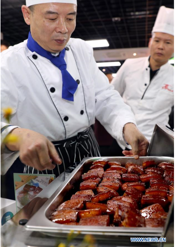 A chef serves braised pork in soy sauce at the canteen of East China University of Science and Technology (ECUST) during the Shanghai University Gourmet Carnival in Shanghai, east China, Dec. 15, 2019. The second Shanghai University Gourmet Carnival kicked off in East China University of Science and Technology on Sunday, displaying more than 70 dishes from 34 colleges and universities in Shanhai. (Xinhua/Liu Ying)