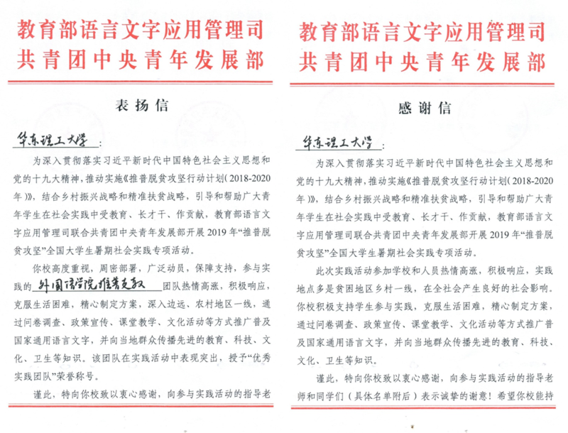 近日,在教育部语言文字应用管理司、团中央青年发展部联合主办的2019年“推普脱贫攻坚”全国大学生暑期社会实践专项活动中,我校外语学院推普支教实践团前往西藏自治区山南市桑日县增期乡开展了为期20天的推普支教活动,并荣获“优秀实践团队”,教育部语用司和团中央青发部专门向学校发来表扬信与感谢信。