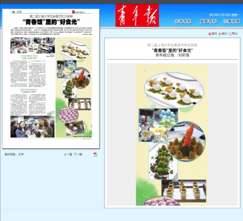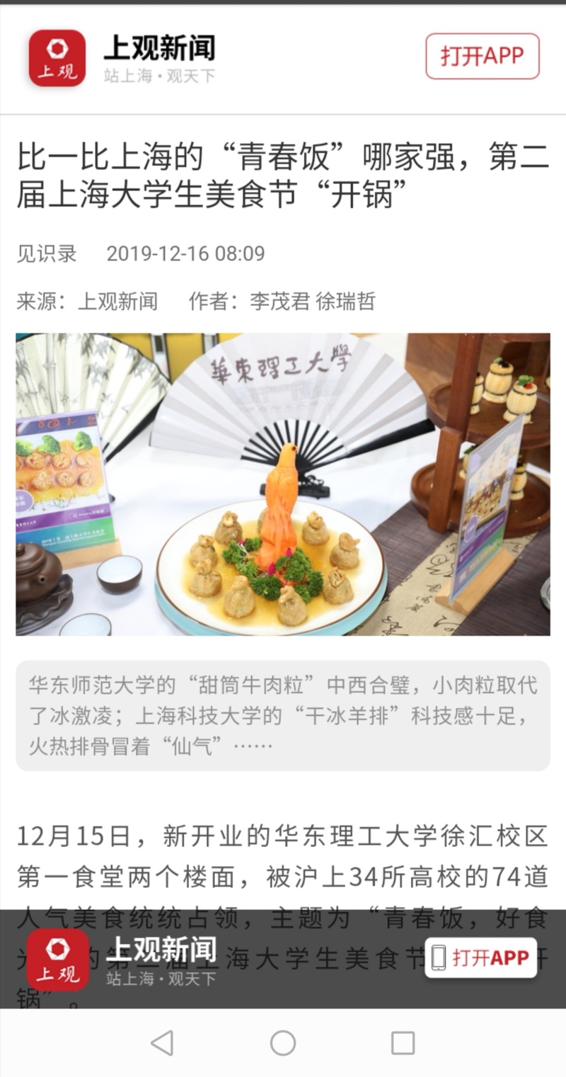 12月15日,由上海市教育委员会主办、华东理工大学承办的第二届上海大学生美食节在我校拉开帷幕,并揭牌成立上海市首个高校后勤劳动教育实践基地(服务育人示范岗)。本次美食节主题为“青春饭,好食光”,紧扣“育人、环保、安全、扶贫、健康”等5大关键词,6大主题区来自上海34所高校的74道人气美食让在场的观众们从味蕾到精神都获得了360度的满足。美食节受到了新华社客户端、新华网(英文版)、人民网、“学习强国”学习平台、中国经济网、上观新闻、看看新闻、新民网、中工网、《青年报》头版、《内蒙古日报》、上海教育电视台、青春上海、劳动观察、周到上海、“上海发布”官微、“上海教育”官微、“文汇教育”官微、话匣子APP等20多家媒体的报道。部分媒体报道如下。