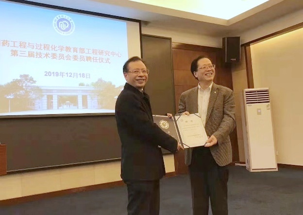 会上,举行了工程研究中心第三届技术委员会委员聘任仪式,复旦大学陈芬儿院士担任技术委员会主任委员,中国医药工业研究总院张福利研究员和我校宋恭华教授担任技术委员会副主任委员,上海凯宝药业股份有限公司王国明总经理、复旦大学王洋教授、中国科学院上海有机化学研究所刘国生研究员、沈阳药科大学何仲贵教授、浙江工业大学苏为科教授、中国检验检疫科学研究院张峰研究员、上海交通大学张万斌教授、上海医药集团股份有限公司张耀华副总裁、中国科学院大连化学物理研究所梁鑫淼研究员、中国科学院上海药物研究所梅雪峰研究员,以及我校叶金星教授、任国宾教授、杨丙成教授担任技术委员会委员。曲景平逐一为技术委员会委员颁发了聘书。